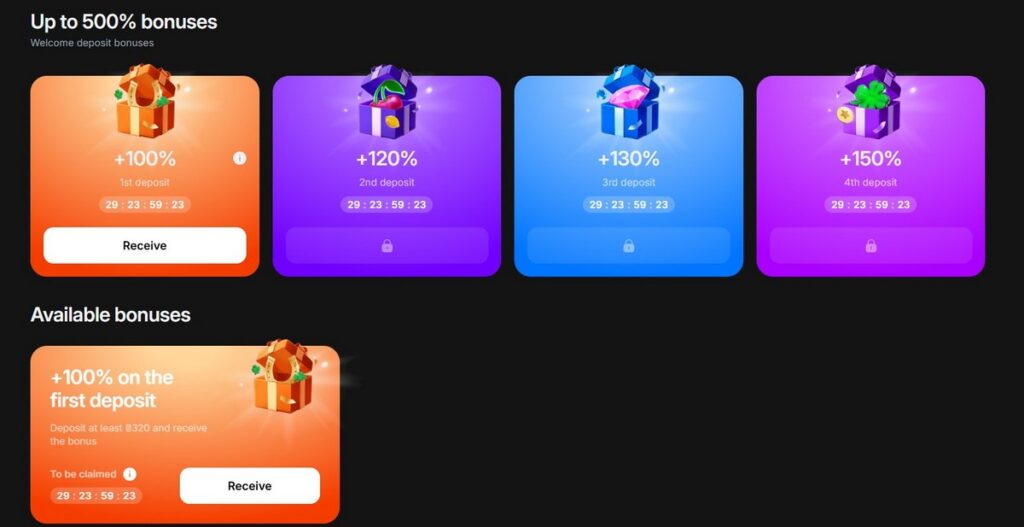 The welcome package contains 4 bonuses totalling 500%. But how to use bonus casino in 1Win? Well, the minimum deposit required to receive a first 100% bonus up to 500 USD is only 10 USD. The wagering requirement for the first deposit bonus is 40x.